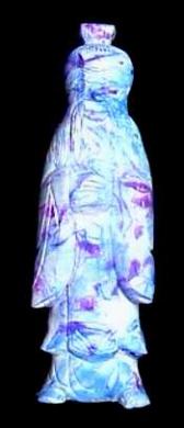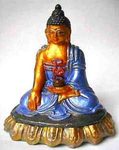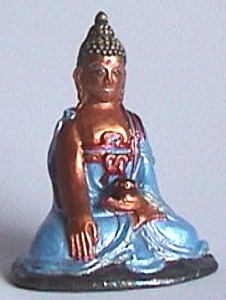 weggepoetst. De boeddha rechts is met meerdere groentinten geverfd en daarna is er een laag blauwe patina overheen gekomen.