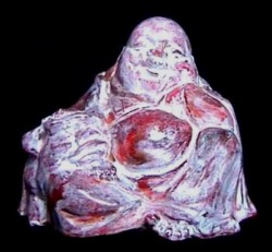 roze lippen en glitters boven de oogleden ;-). De rechterboeddha vind ik ook schitterend, omdat ik het wat Maya-achtigs vind hebben met dat 'whitewash' erover. |