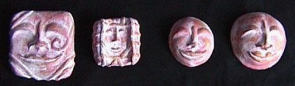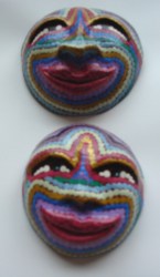 ~ het meest linkse gezichtje is 9x9 cm Deze gezichtjes zijn mijn meest recente creatie. Ik heb een serie gemaakt van twee vierkante gezichtjes en drie ronde gezichtjes die in grootte verschillen. Hieronder zie je hoe deze gezichtjes er nu uitzien. |