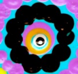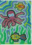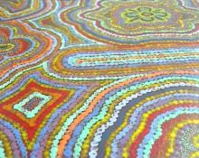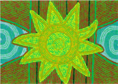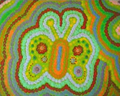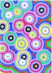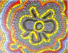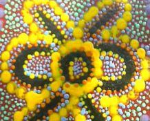 Aboriginalschilderij Hoogte: 30 cm Breedte: 40 cm Dit schilderij is geďnspireerd op de aboriginalkunst. Alle stippen zijn gemaakt met de achter- en voorkant van een saté-prikker. Een heel karwei dus, maar ik vind het zeker de moeite waard! |