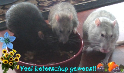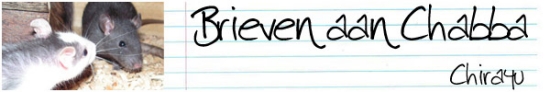 -> Chirayu - 13 mei 2006 Hoi baasje van Chirayu en Chirayu en de andere kerels, Ik sta nu ook op de website van m'n baasje! Ik mag daar van alles vertellen, alhoewel ik heb gehoord dat echt roddelen niet mag. Marlee en Zeke zeggen dat ze dan terug gaan roddelen en dat ze het me heel moeilijk zullen maken. Over Izumi mogen we wel een beetje roddelen, maar dat vind ik dan ook niet eerlijk (hij is groot en ik ben klein). Over Izumi gesproken, hij krijgt nu een nierdieet. Marlee en Zeke zeggen dat hierdoor de scherpe randjes van z'n karakter wat zachter worden. Izumi is laatst zelfs bij ons in de kooi geweest! Zeke was er niet bij en dat vond Marlee geloof ik een beetje eng. Marlee zei dat ik stil moest blijven zitten en dat ik m'n mond moest houden tegen Izumi. Izumi zette z'n haren wel overeind, maar verder gebeurde er eigenlijk niets. Volgens mij is hij best wel een beetje aardig, ondanks de griezelverhalen die Marlee en Zeke 's avonds graag over hem vertellen. Kom snel maar eens op onze site kijken, dan zien jullie hoe groot en sterk ik al ben. We mochten ook een stukje over rattentaxi's schrijven en ik heb gezegd dat die heel erg tof zijn! Veel yoghurtsnoep toegewenst van jullie toegenegen broer en vroegere vriendje, CHABBA |