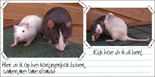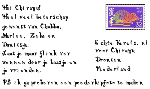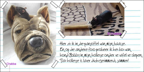 -> Chabba - 13 mei 2006 Heej Chabba! en baasje van Chabba en vriendjes van Chabba! Wat vet dat je nu ook je eigen stukje op de site hebt! Leuk he zo'n site waar je zelf alles mag vertellen ![]() Hier gaat het ook allemaal goed, ik ben al aardig beschimmeld volgens Ome Nomad...omdat ik wit word, maar das niet zo erg, ik vind het wel grappig eigenlijk ![]() Ik vermaak me nog steeds prima met mn nieuwe vrienden! Ome Nomad verteld altijd leuke verhalen over Pasta de muis. Hij beleefd heel veel avonturen echt grappig! Heej misschien kunnen we onze brieven naar elkaar ook op de site zetten, das wel grappig, dan weet iedereen hoe het met ons gaat ![]() Je krijgt trouwens de groeten en een dikke knuffel van de andere kerels hier ![]() Dikke knuffel, je broertje Chirayu |