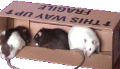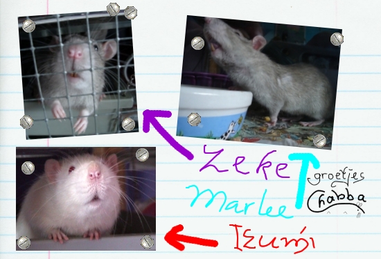 -> Chirayu - 12 april 2006 Chirayu, ik mis je! Maar ik heb het erg leuk bij Marlee en Zeke. Het is wel vrij saai in de kooi met maar 2 andere ratjes, maar ik houd de gang er wel in. Bedankt ook voor je reactie in ons gastenboek!! Ik mag al loslopen in de woonkamer en dat is erg leuk. De baasjes zeggen dat ik stoerder ben dan Marlee en Zeke. Het baasje heeft zojuist op het rattenprikbord foto's van ons geplaatst, zo kun je gelijk zien dat Marlee en Zeke best wel jofele kerels zijn. Geen echte kerels natuurlijk, maar dat zal ik ze nog wel leren! Doe je iedereen de groetjes van me? Ik hoop dat jij je een beetje staande kunt houden tussen al die grote kerels, maar voorzover ik heb gemerkt, zijn het allemaal wel toffe peren. Een dikke knuffel van Chabba en geef al die echte kerels maar een hapje in hun bil van me! |