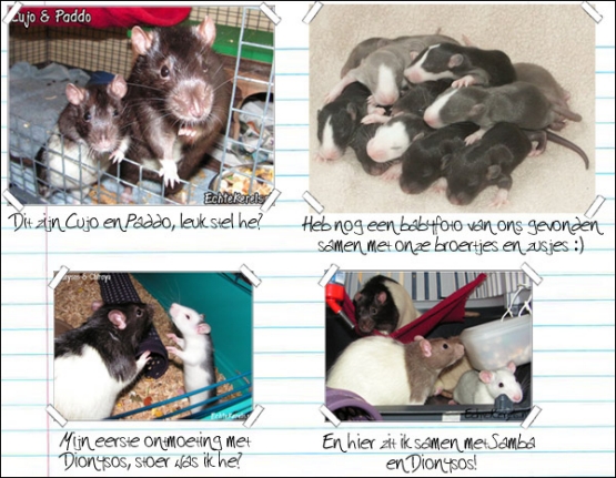 vrienden geworden. Daarna kwamen m'n eigen baasjes me ophalen en leerde ik Marlee en Zeke kennen. Zij zijn erg leuk, maar ik zal m'n liefste broertje natuurlijk nooit vergeten! Dus we laten elkaar af en toe weten hoe het met ons gaat. Mijn Ome Nomad woont daar ook; Chirayu en ik zijn achterneefjes van hem. Het baasje van Chirayu kent Marlee en Zeke ook, want zij heeft ze geknuffeld toen ze met de rattentaxi meegingen. En mijn baasje kent de vriendjes van Chirayu van toen ze mij ophaalden. |