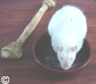 Symptomen van nierklachten kunnen zijn: - moeheid - jeuk - verminderde eetlust - misselijkheid - buiten adem zijn - vocht vasthouden - zwakte - 'hersenstoringen' (vergiftiging van de hersens, wat verwardheid / ongecontroleerde bewegingen en evt. coma en daaropvolgend de dood kan veroorzaken) Testen op nierfalen Omdat ik al wat ouder ben, werd bij de dierenarts mijn urine getest. Hierin zaten een soort platgestampte bloedcellen, die waarschijnlijk uit mijn nieren kwamen. Nadat ik antibiotica heb gehad om eventuele andere oorzaken zoveel mogelijk uit te sluiten, werd mijn urine nogmaals getest. Helaas bleek er nog steeds een soort bloedachtige stof in te zitten. Van de dierenarts kreeg het baasje een dieet mee uit het boekje The Scuttling Gourmet van Alison Campbell. Hierin staat veel informatie over voeding van ratten, waaronder bij nierproblemen. Dit niervriendelijke dieet krijg ik nu. Hierdoor ben ik veel vrolijker geworden, dat valt zelfs mijn baasjes op. Ook ben ik ietsje aangekomen. Het baasje denkt dus dat het dieet goed werkt. Als het dieet niet goed zou werken, zou het gehalte van ureum en creatine in mijn bloed nog kunnen worden getest. Met zo'n bloedtest kan met meer zekerheid worden gezegd of het om de nieren gaat (en niet om iets anders wat misschien met andere medicatie moet worden behandeld). Geneest het helemaal? Nee, nierproblemen kunnen niet genezen, maar door goede proteïnen te geven en fosfor zo veel mogelijk te vermijden, kan de ziekte wel worden vertraagd. De dierenarts zegt, dat nieren een soort filters zijn en dat klachten pas ontstaan als deze filters voor een groot deel verstopt zijn. Dan kunnen de filters hun werk niet meer goed doen. Een te hoog gehalte aan fosfor in het voer zorgt ervoor, dat de nieren extra hard moeten werken om dit af te breken. Als deze filters niet meer goed werken, kunnen schadelijke stoffen in het bloed blijven zitten, wat veel ongemak geeft. Soms wordt zelfs calcium aan de botten onttrokken, om het fosfor te neutraliseren. Hierdoor kunnen ook gewrichtsklachten ontstaan. Het niervriendelijke dieet Met toestemming van de auteur van het Kidney friendly diet, Alison Campbell, heb ik dit dieet voor zover mogelijk (in verband met de verkrijgbaarheid in Nederland) in het Nederlands vertaald. Het dieet is ook (in het Engels) na te lezen op haar website: www.shunamiterats.co.uk (bij 'Articles and Info', onder het kopje 'Nutrition'). In haar Engelse boek The Scuttling Gourmet staan veel wetenswaardigheden over rattenvoeding en voedingswaarden. Als je belangstelling voor dit boekje hebt, kun je contact met me opnemen. Het niervriendelijke dieet bestaat uit een (zelf samen te stellen) seniorenvoeding, aangevuld met supplementen. |