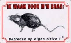 ![]() Tarkan: De baasjes hebben dit bordje boven de voordeur hangen, zodat inbrekers weten waar ze aan beginnen als ze bij ons willen inbreken. Omdat er "Betreden op eigen risico" bijstaat, zijn de baasjes niet verantwoordelijk voor ziekenhuiskosten als wij een inbreker te grazen nemen. Omdat ik een rexrat ben, lijkt het me erg leuk om inbrekers te vangen, maar het baasje zegt dat hier geen inbrekers komen, omdat de meeste inbrekers bang voor ratten zijn.