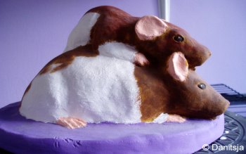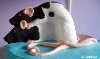gemaakt. Deze ratjes moesten heel stil blijven zitten, omdat ze op een bruidstaart moesten staan, maar niet van de slagroom mochten eten. Dat was heel moeilijk om echte ratjes aan te leren, dus heeft het baasje ratjes van gips gemaakt. Het witte nep-ratje moet Rakker voorstellen en de zwarte lijkt op Lodewijk. Ik vind het wel vervelend dat m'n baasje zulke dingen maakt, want dan zit ze ons heel lang te begluren. Dan zegt ze: "Iggy, klopt het dat jij een puntneus hebt en de rest van de ratjes niet?" en dan voel ik me wel een beetje gek. Ik weet namelijk alleen hoe de andere ratjes eruitzien en niet hoe ik er zelf uitzie. |