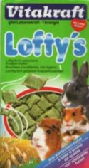 Lofty's Bruce: Bietensnoepjes vind ik niet zo heel erg lekker meer en ik heb ze al een paar keer geweigerd. Nu hebben de baasjes Lofty's gekocht die zijn wel heel erg lekker. Het was wel even schrikken toen ze de samenstelling voorlazen, want naast haver en suiker zitten er ook brandnetels in. Maar de brandnetels prikken niet en daarom vind ik ze best lekker. De vorm is mij nog wel een raadsel, want de snoepjes zijn in de vorm van een luchtig kussentje gemaakt. Eén keer heb ik geprobeerd om op zo'n kussentje te slapen, maar toen ik wakker werd was het kussentje verdwenen en niemand wist waar het was gebleven. Bobmar: Ik snap ook niet hoe die Lofty van Bruce zomaar verdwenen is. Ik vind deze snoepjes trouwens erg lekker, net als de rest. |