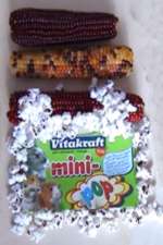 Mini-Pop Djaman: Dit is heel gezellig voer, want je kunt het samen met je baasje opknabbelen. De maïskolfjes moeten in de magnetron en als het gaat ploppen krijg je echte popcorn! Deze popcorn is speciaal voor knaagdieren, dus niet gezoet of gezout, en heel gezond. De popcorn kregen we zomaar van Elfke, dus we zijn nu allemaal gek op haar. Bobmar was ook al helemaal weg van Elfke, want hij en Helios hebben daar ooit gelogeerd en toen werden ze heel erg verwend. Helaas vond het baasje het niet goed, dat ik zo'n maïskolf mee naar de kooi probeerde te slepen. Maar dat zei ze natuurlijk pas, toen ik de kolf al helemaal naar de bovenste verdieping van de kooi had gesleept en ze alles had gefilmd. |