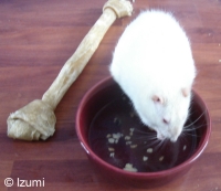 De ratjes Ik ben nu wel aan de ratjes gewend. Ik heb af en toe aan ze mogen snuffelen en heel soms loopt Izumi los door de kamer. Het baasje houdt me ![]() Op de boerderij had ik wel eens ratjes gezien, maar die zijn heel anders dan de ratjes hier. Daar renden ze keihard weg als ze me zagen, maar Izumi loopt zo op me af! Dat is wel een beetje eng hoor, want Izumi is best groot en je weet nooit of hij het ineens in z'n kopje krijgt om in me te klimmen. ![]() Ik denk dat het baasje me niet helemaal vertrouwt bij de ratjes, maar dat komt ook omdat ik soms heel hard achter eendjes aanga, terwijl m'n baasje altijd zegt dat eendjes heel erg lief zijn. Maar ik kan dat natuurlijk niet laten; eendjes horen voor zover ik weet niet bij mijn roedel, dus ik kan geen enkele reden bedenken waarom ik daar niet achterna mag zitten. Weet je wat trouwens gek is? De baasjes zeggen dat ik maar bof dat hier ratjes wonen. Soms ben ik daar ook wel blij mee, want als de ratjes een snoepje mogen, vraagt het baasje eerst aan mij of ik ook eentje lust. En rattensnoepjes zijn heel erg lekker (wel een beetje klein)!