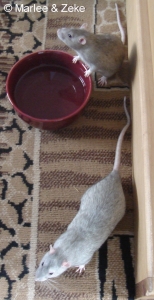 ![]() Izumi: Wij een probleem? Let wel een beetje op je woorden, want wij waren hier het eerst! En wij zijn nog steeds het belangrijkste èn in de meerderheid. Als het niet om die andere beesten was waar je aan gewend was, hadden de baasjes je misschien niet eens opgehaald. Want de baasjes houden niet zo van stabij's, ook al zijn het kruisingen. Iggy: Izumi, rustig toch! Ik dacht juist dat een van de baasjes helemaal gek op kruisingstabij's was en dat wij inderdaad een probleem vormden. Ze zei dat ze absoluut geen stabij wilde hebben om hun jachtinstinct, omdat dat niet bij ons zou passen. Izumi: Oh ja, nu herinner ik het me weer. Het baasje zei dat Bijke, de kruising van haar oma, zomaar een mol had gevangen terwijl ze aan een korte riem zat. Maar ik snap dus echt niet waarom er nu wel zo'n gevaarlijk beest bij ons rondloopt. Iggy: Wij zijn natuurlijk geen mollen, wij zijn veel slimmer! Op de pagina van Tarkan en Tibilé staat een stukje over een fox-terriër die hier logeerde, en dat ging helemaal niet goed. Volgens mij heeft die hond dagenlang de kooi geterroriseerd en kon hij de ratten niet met rust laten. De baasjes zouden Bobby terugbrengen als Bobby ook zo obsessief op onze rattenvilla zou reageren, maar Bobby negeerde onze kooi, alsof wij niet bestonden. Izumi: Dat is dan wel slim van de baasjes, dat ze dat eerst getest hebben. Maar ik vind het niet zo eng als Bobby buiten de kooi rondloopt, want hij zit ons nooit echt hongerig aan te staren. Bobby: Ik geloof dat de ratten een beetje bij de roedel van de baasjes horen, de baasjes noemen ze ook steeds puppies. Volgens mij zijn de baasjes een beetje gek, maar als hun het puppies vinden, dan is dat maar zo (het zijn wel erg vervelende puppies). |